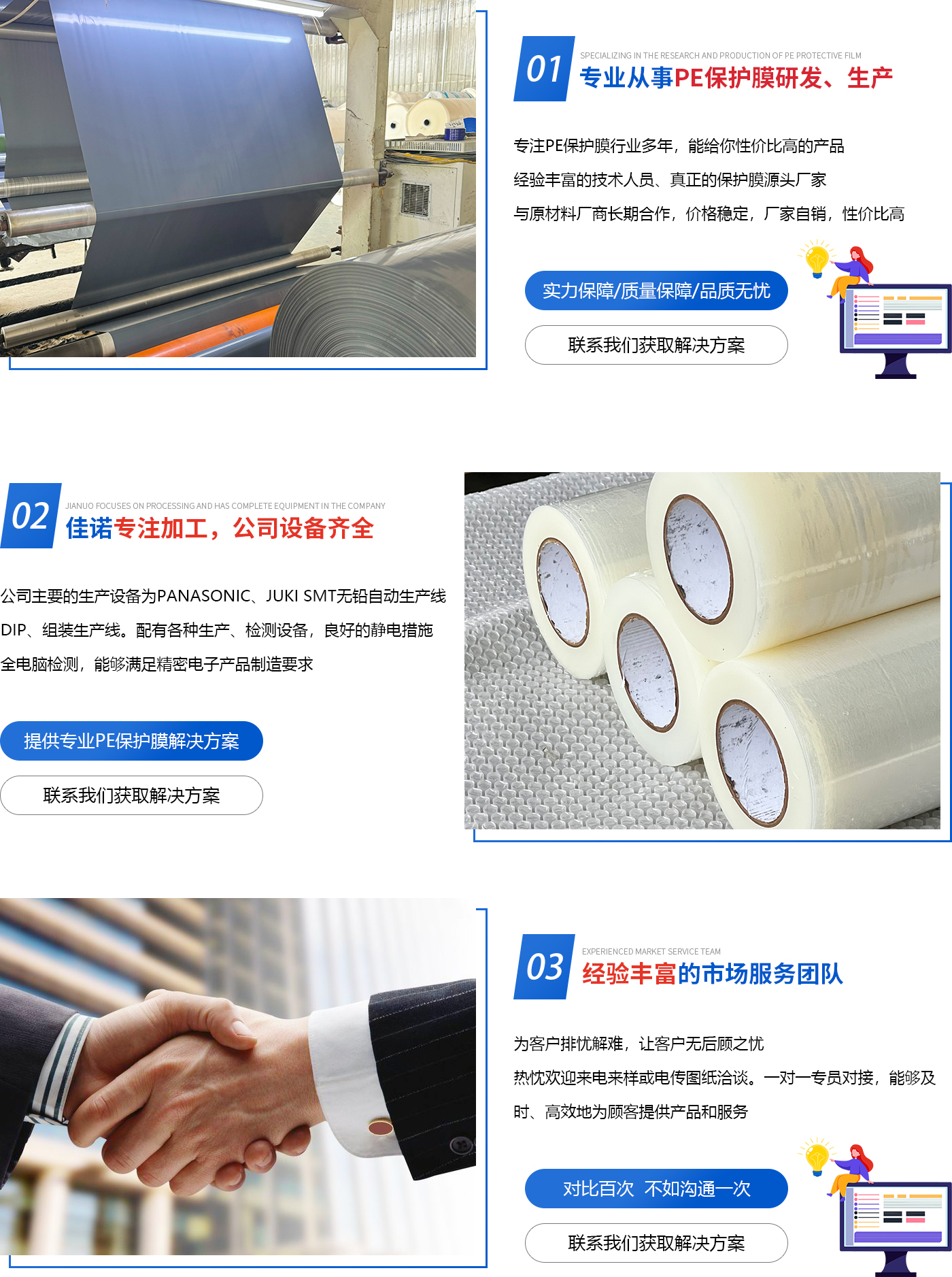德州佳诺塑业有限公司生产防静电自粘膜,包装膜,筒子膜,原模,各种PE保护膜以及保护膜基材。公司生产保护膜、胶带,是各类不锈钢板、彩钢板、铝塑板、防火板、塑钢型材、装饰板、有机玻璃制品、漆面板、镜面板、外墙板,保温板,石英石,大理石,人造石,瓷砖,防盗门,木门,不锈钢门窗,各种装饰面板,各种建筑板材、地毯,以及电子、家用电器、家具、汽车制造,等行业不可缺少的表面保护材料。使被贴物在运输、加工、贮存和使用过程中不受污染、腐蚀、划伤,保护原有的光洁亮泽的表面,从而提高产品质量。 本公司产品用于铝型材,PVC等材质型材保护膜,铝门等铝制品保护膜,铝塑板,不绣钢,铝合金等产品表面保护膜,保护其在运输途中,生产,安装时对产品表面所造成的刮伤,灰尘等。可用于,汽车门,木地板,冰箱表面等家电及电子产品表面的保护。 基材:PE材质 粘性:低粘,中粘,高粘,特高粘 膜材:透明膜,蓝膜,黑白膜,乳白膜 ( 除蓝膜外,其...